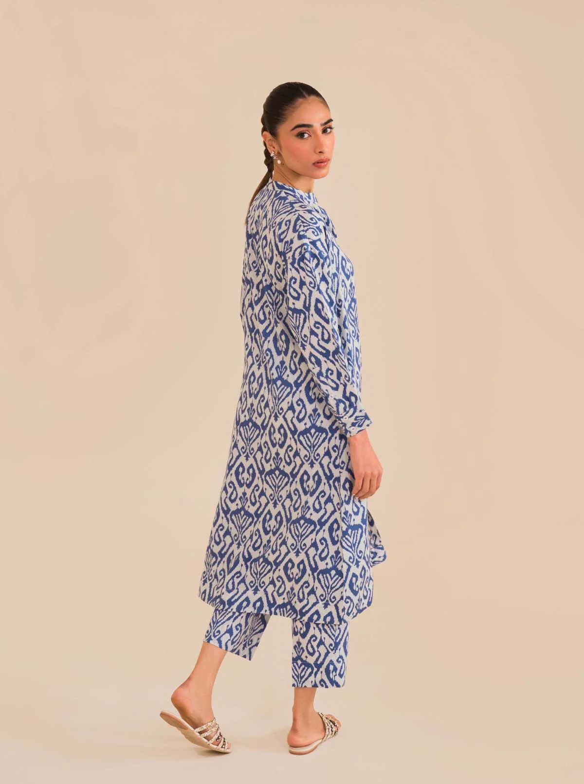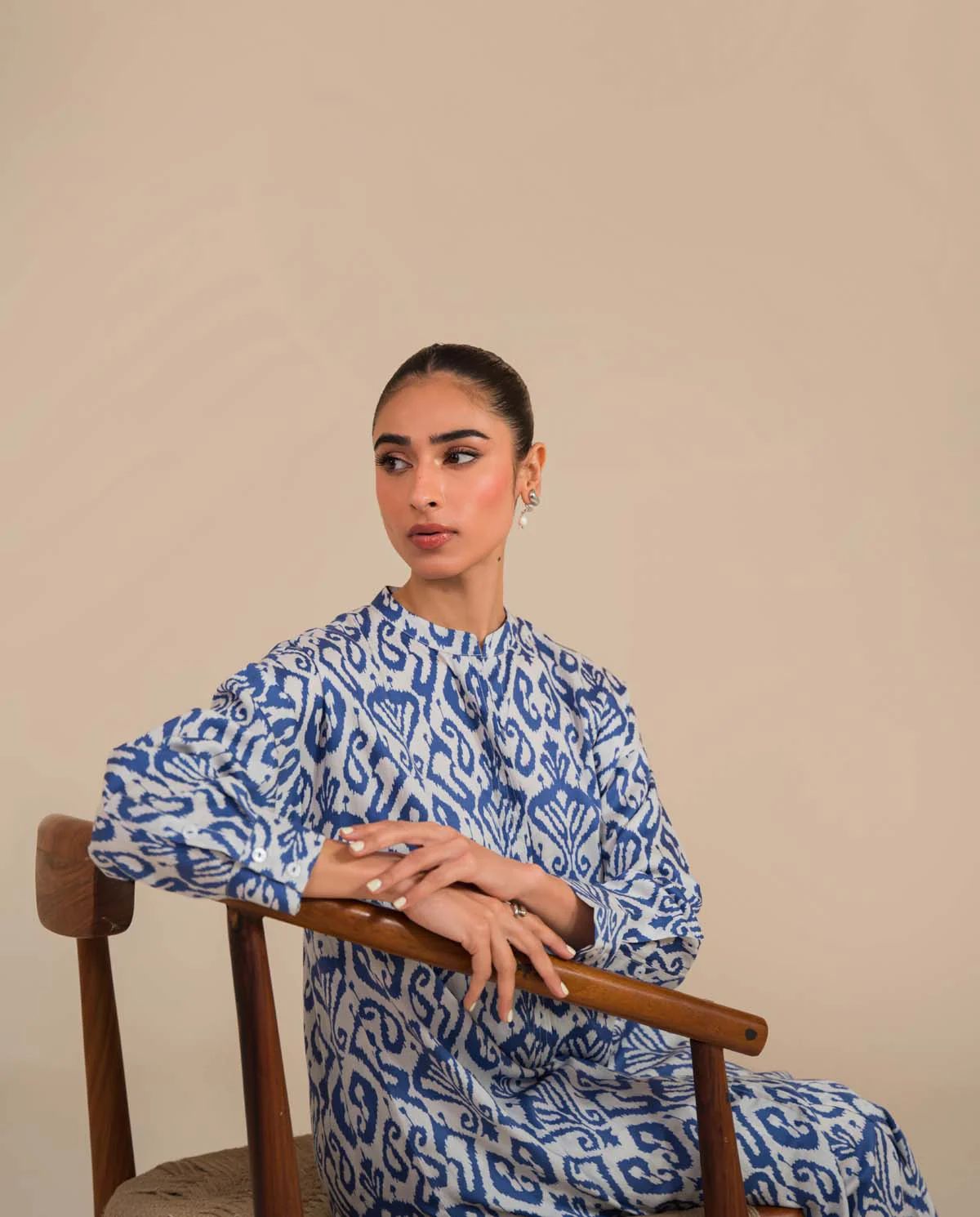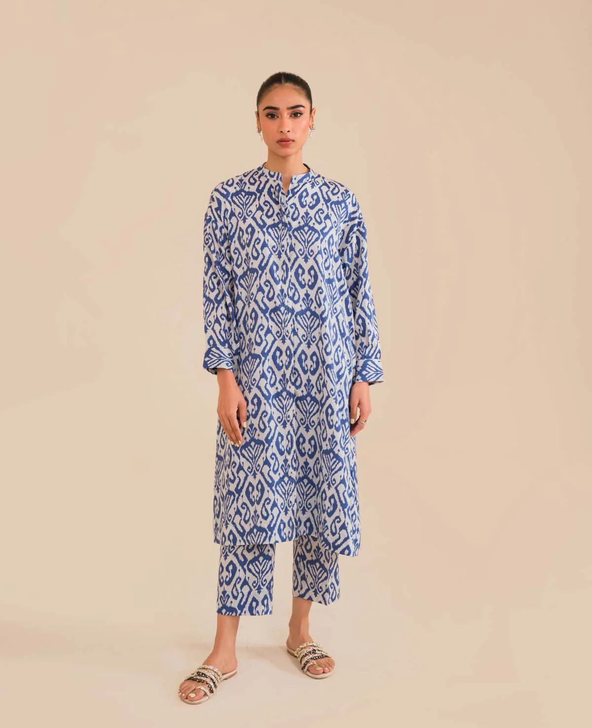2pc "Azure" is a captivating ethnic-themed "IKAT" printed Co-ord outfit. Featuring a double-placket kameez, cuff sleeves and matching culottes. A stylish new look, the perfect option for daily wear.