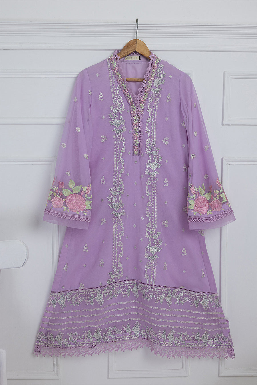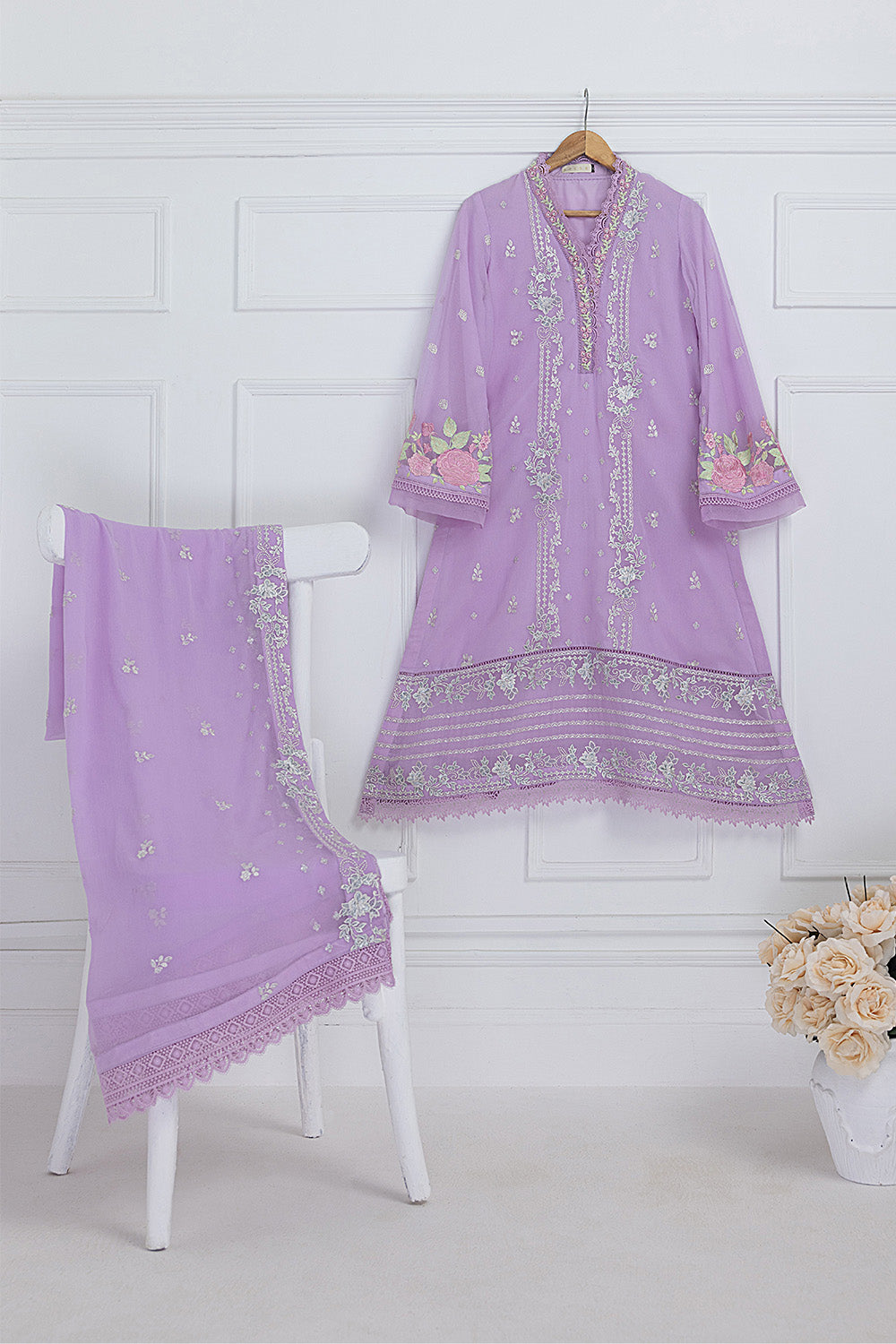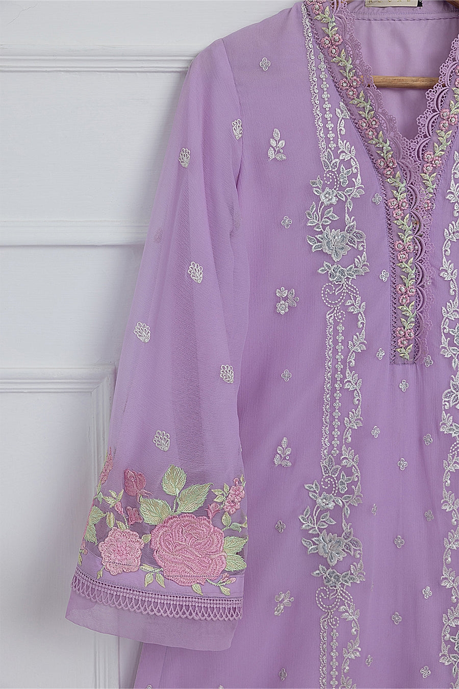 Description: Featuring a lovely chiffon ensemble in a soul-pleasing lilac hue, festooned with delicate accents that ooze elegance and charm, The gorgeous decorations of delicate pearls on the neckline add to the grandeur. The borders and sleeves are adorned with enchanting floral lace. It is paired with a chiffon dupatta that is embellished with modest embroidery and has a lace-trimmed pallu that gives a touch of ethereal elegance to the outfit by draping gently over the shoulder.