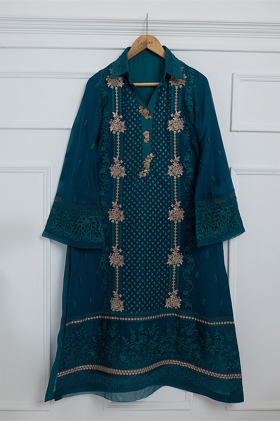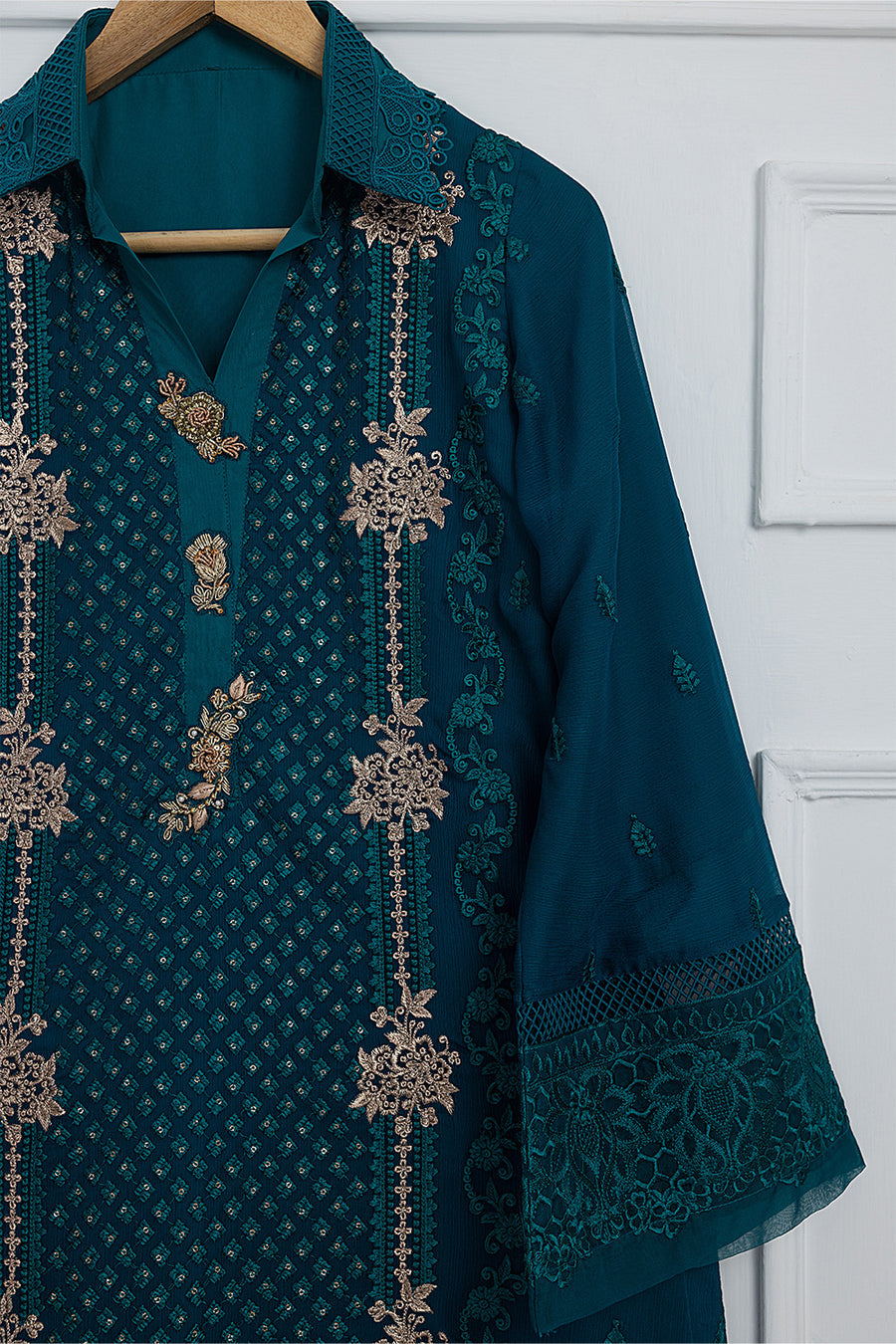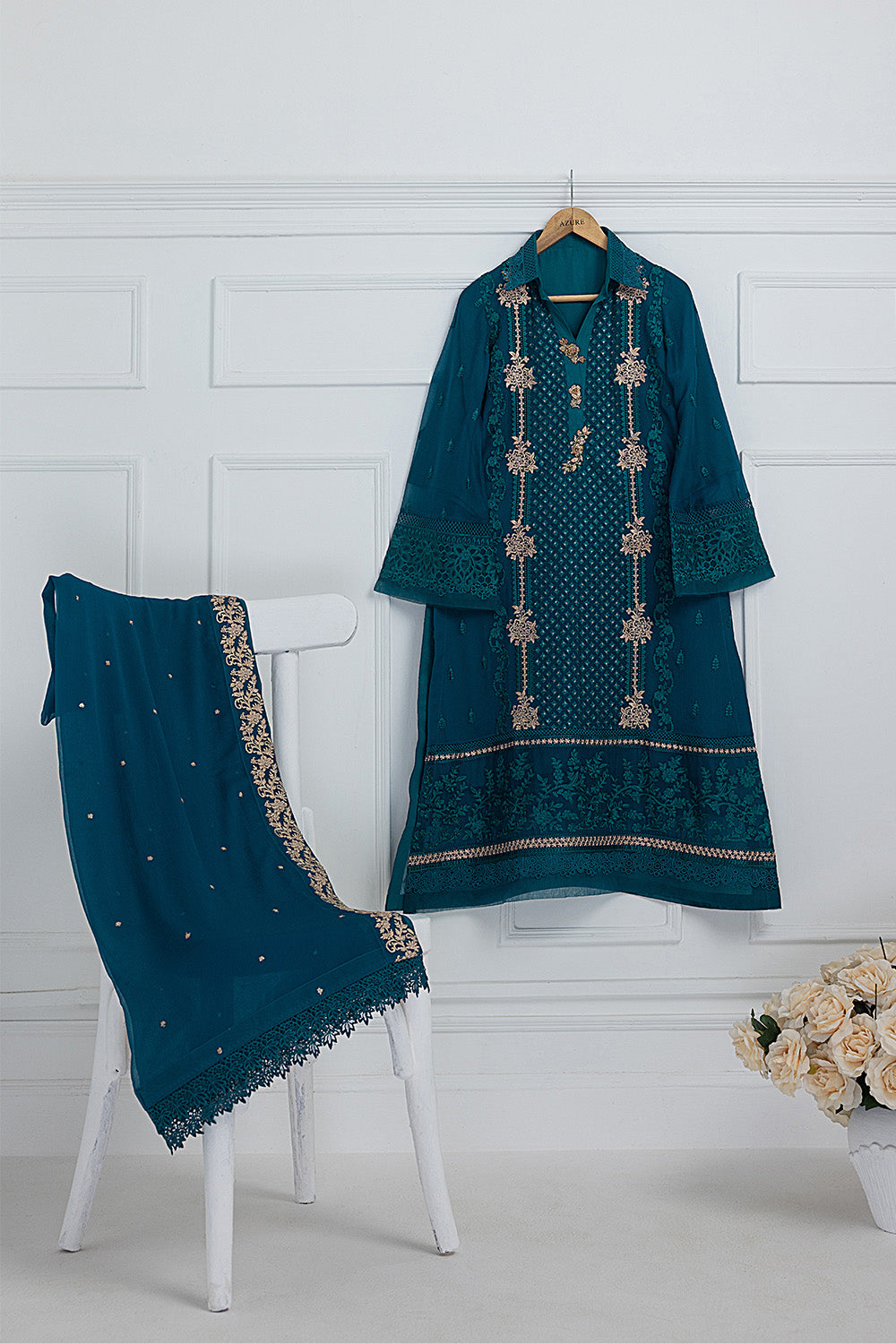 Description: Introducing the exquisitely crafted chiffon suit. This suit is designed to make a lasting impression on any special occasion. The neckline of the suit is adorned with three bunches. Meticulously handcrafted with delicate materials such as kora, dabka, and Resham. The sleeves of the chiffon feature a floral cutwork lace. Completing the ensemble is a chiffon dupatta, that matches the fabric, and completes the overall design of the suit.