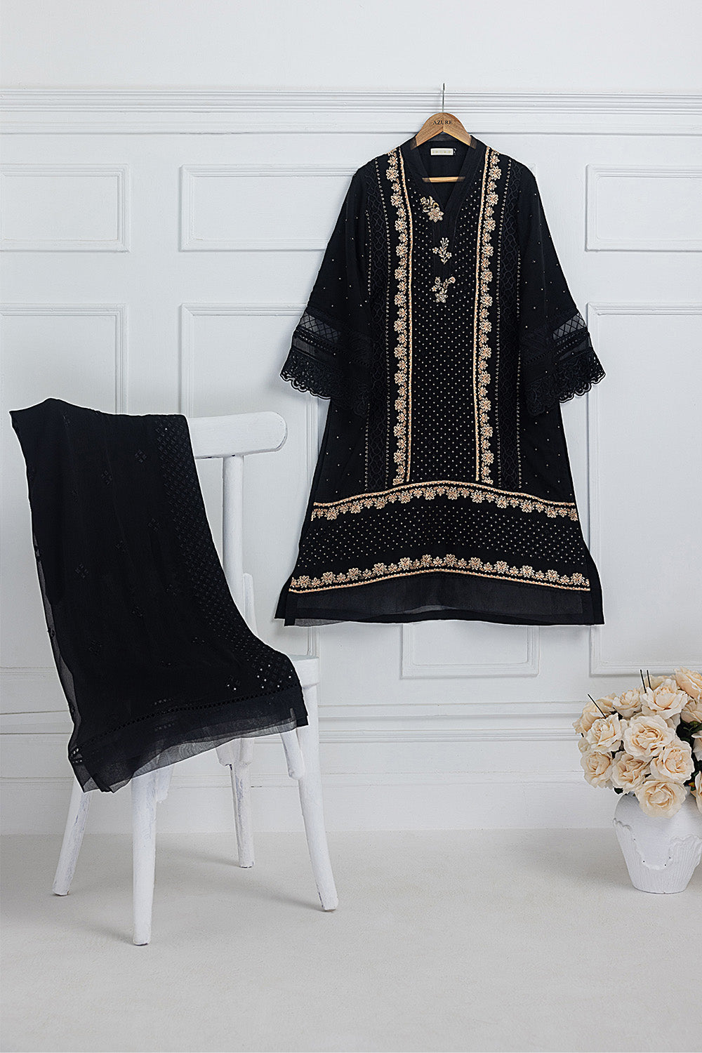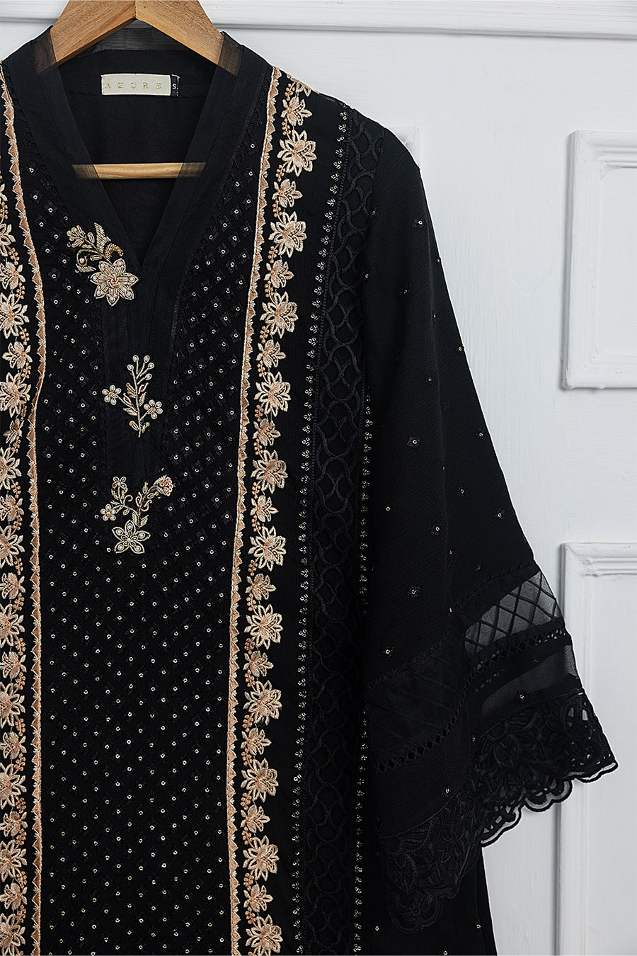 Description: This incredible, mesmerising black ensemble is made of chiffon textile fibers. This straight-cut shirt comes with an attached lining decked out all over with sequins and floral motifs, with hand-embellished floral bunches on the ban collar neckline done up with kora and dabka. Complement this look with a chiffon dupatta embroidered with sequins and an organza-finished pallu to lend a touch of sophistication.