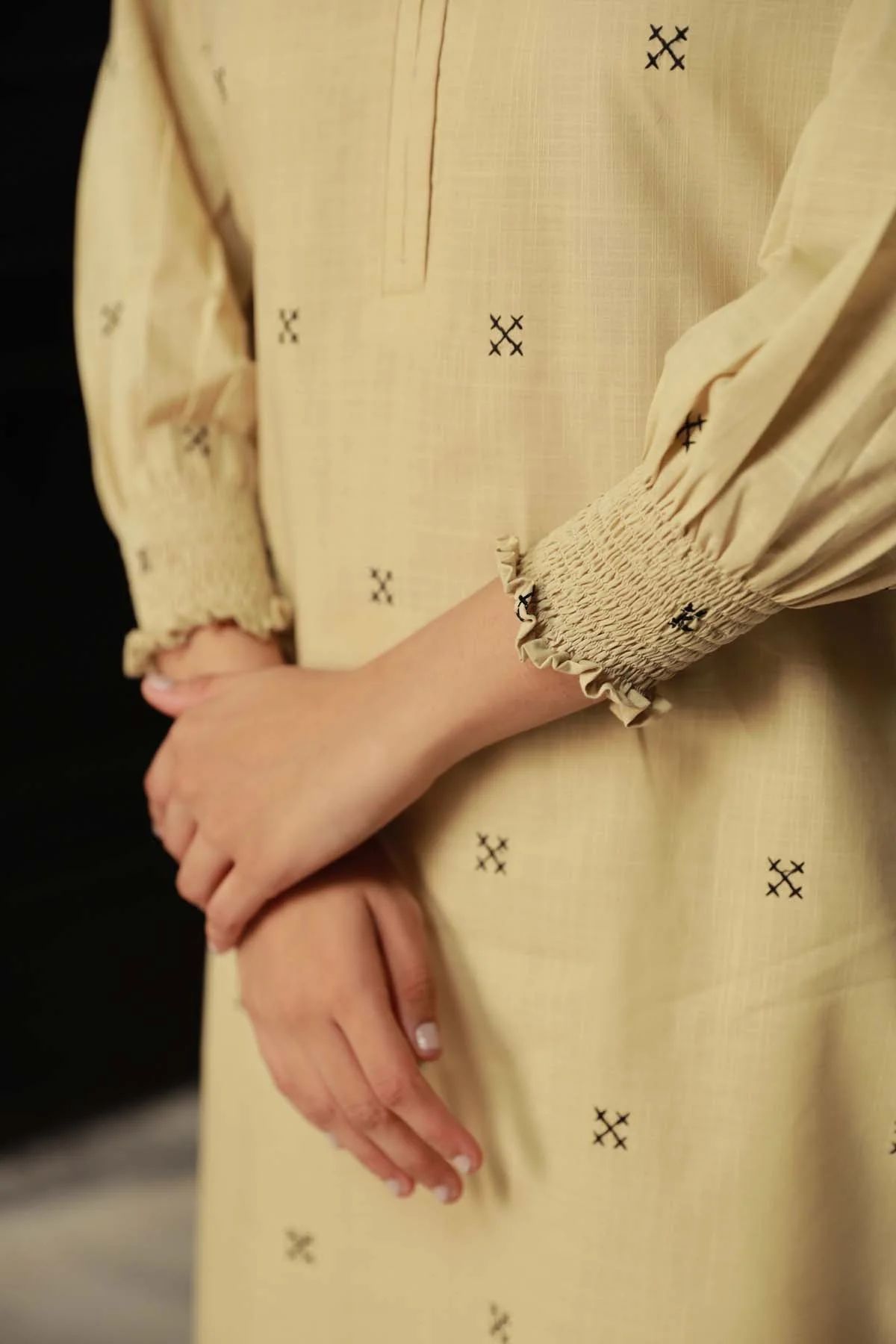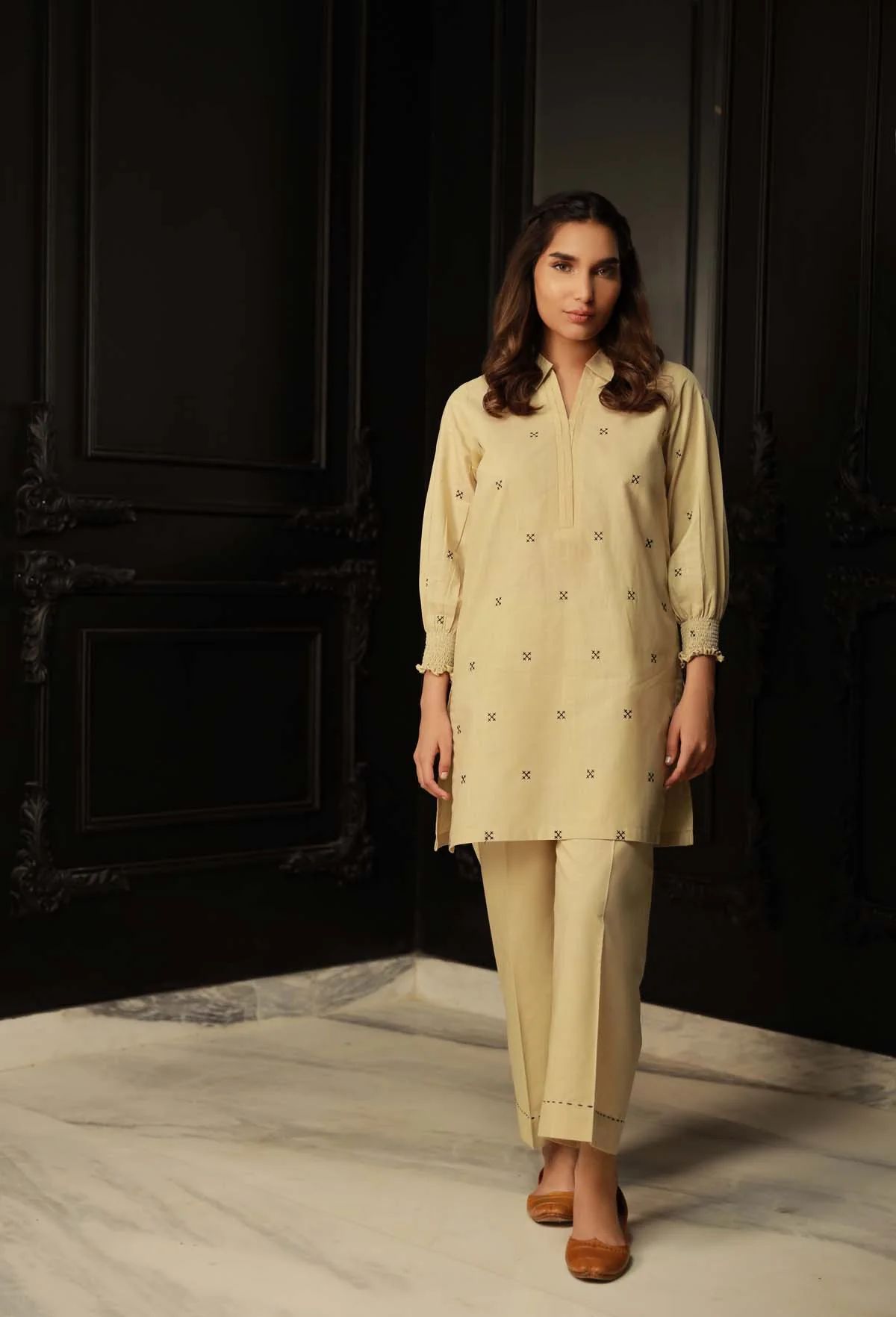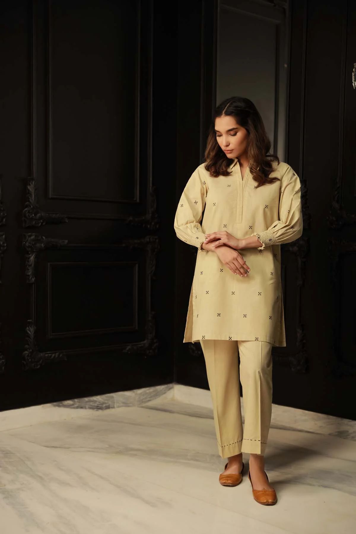 2pc Dune is a exquisite sandy-beige colour co-ord outfit. Features spread-collar neckline and shirring sleeves. Paired with straight-cut trousers. Perfect trendy wardrobe for styling in smart-casual and outdoor occasions.