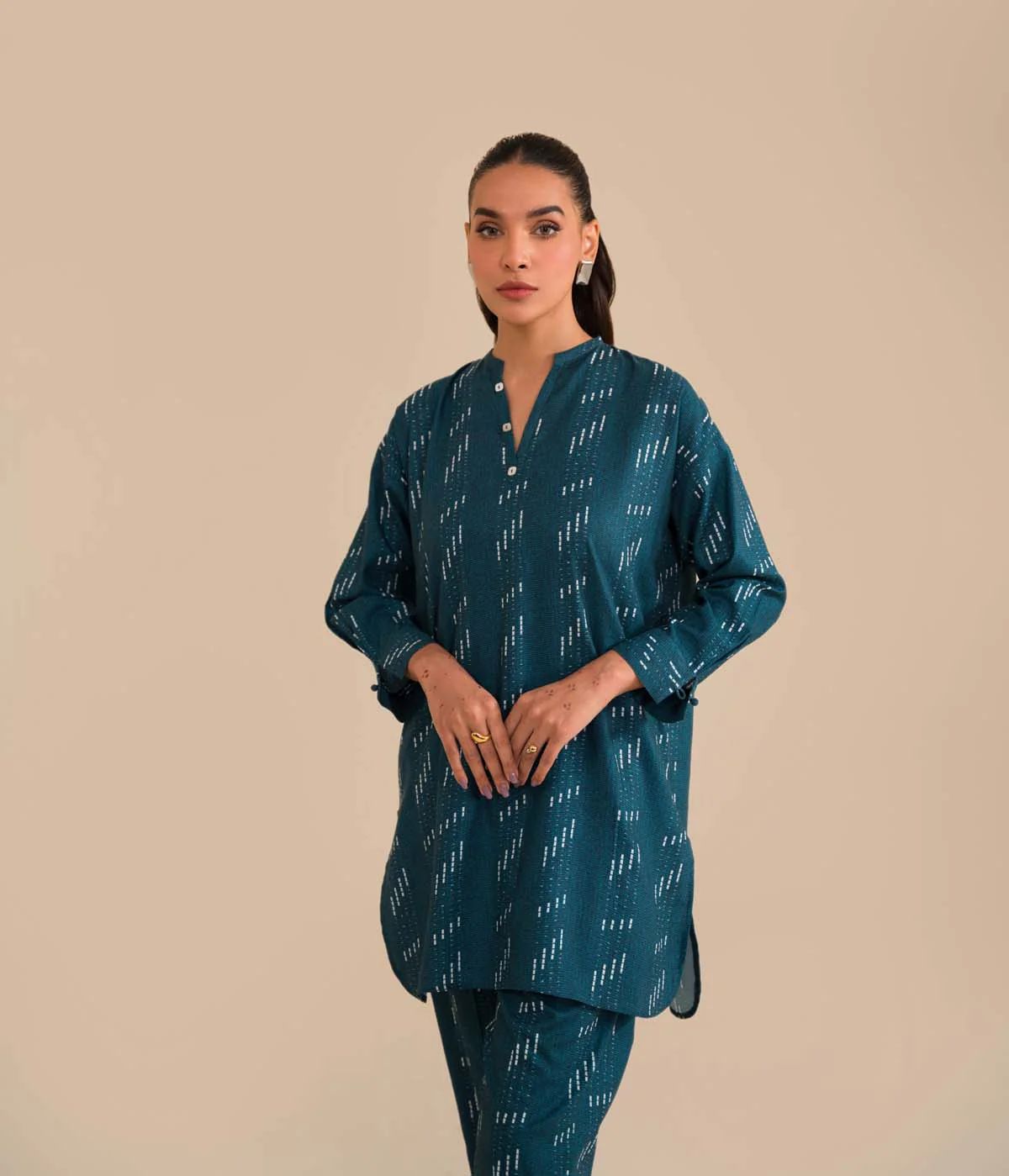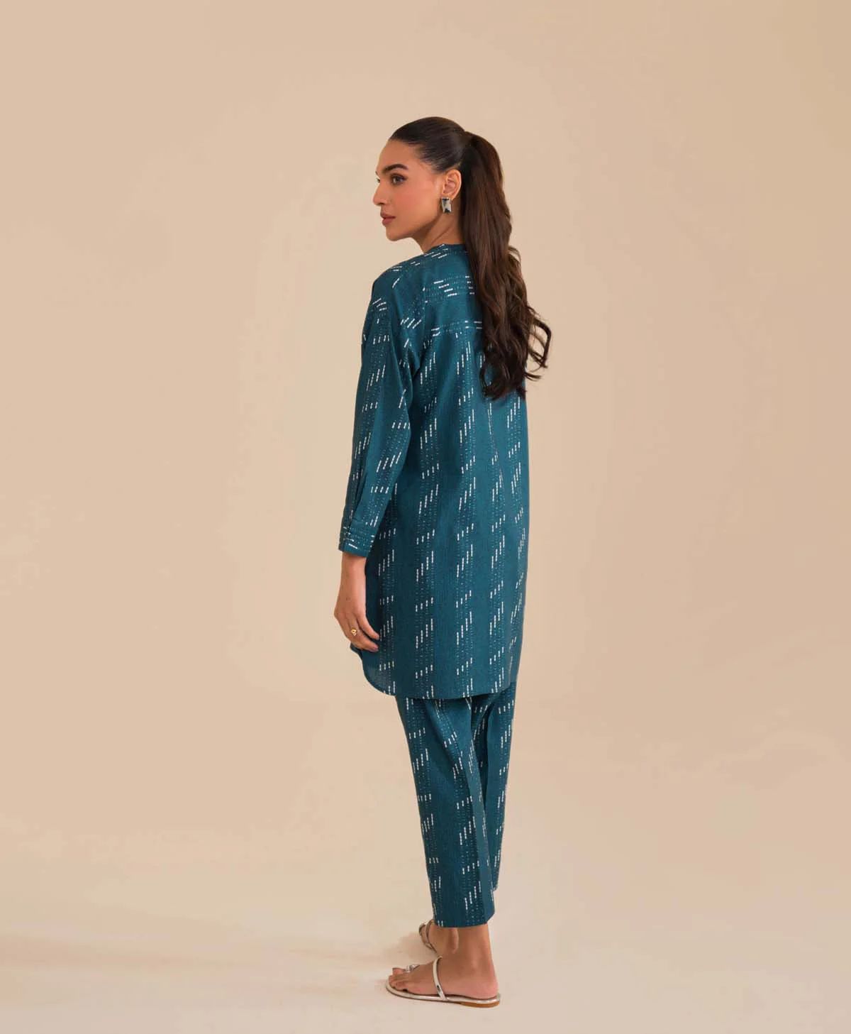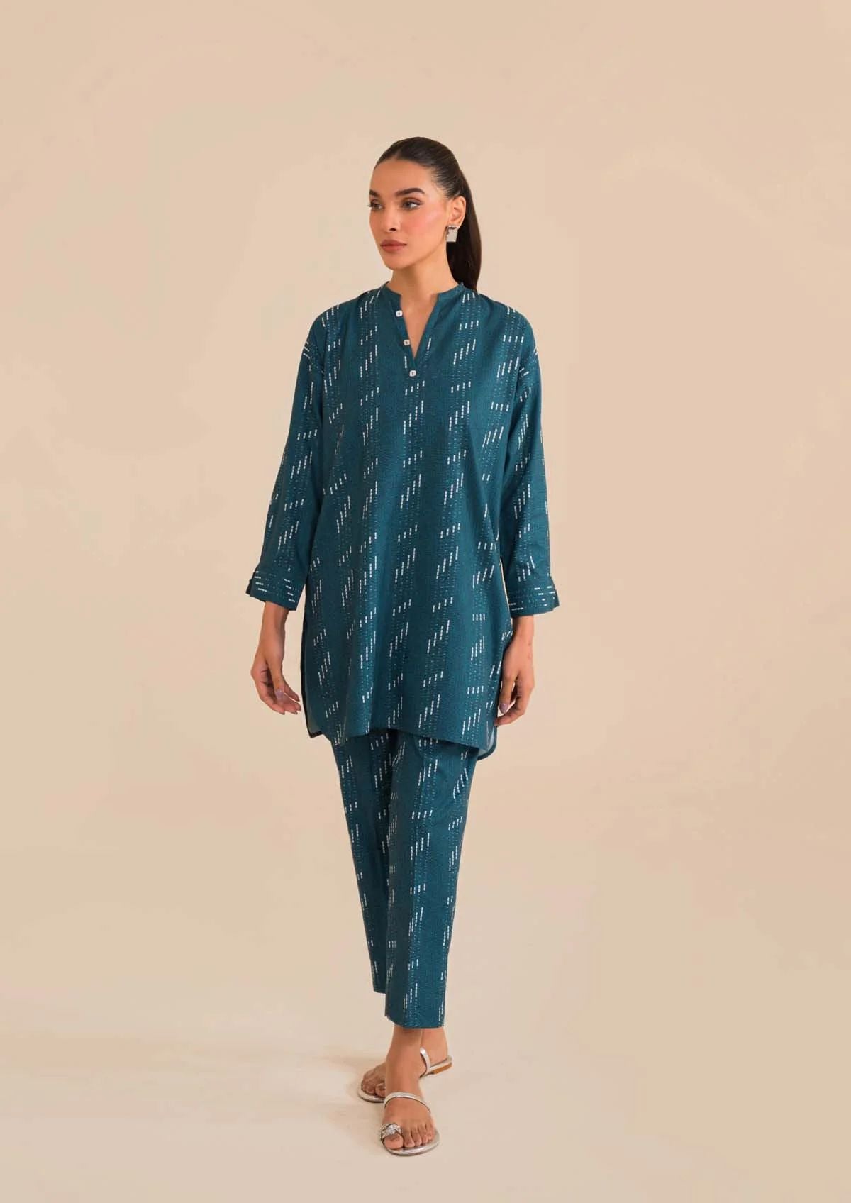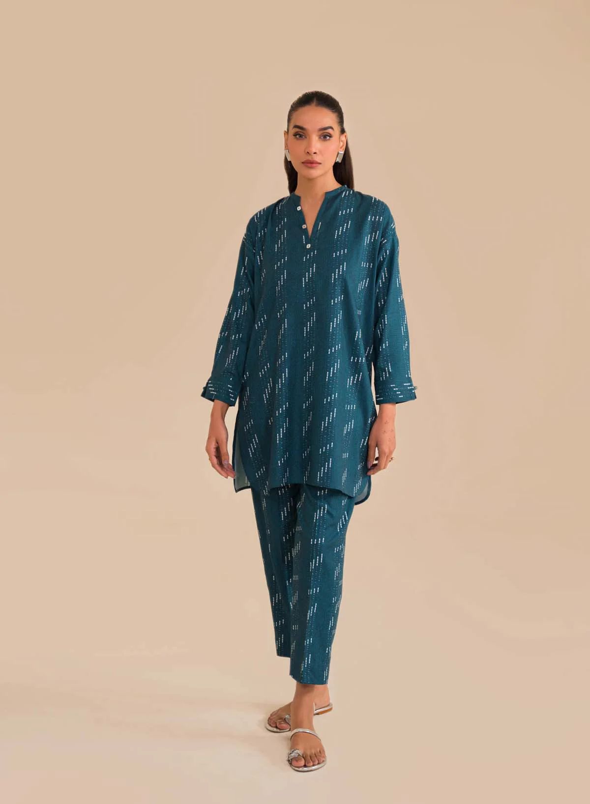 2pc "Rhythm" is a stylish teal colour co-ord suit. Featuring geometrical pattern texture Printed design , cuffed sleeves and V-collar neckline with button embellishment on the placket, paired with smartly designed trousers.