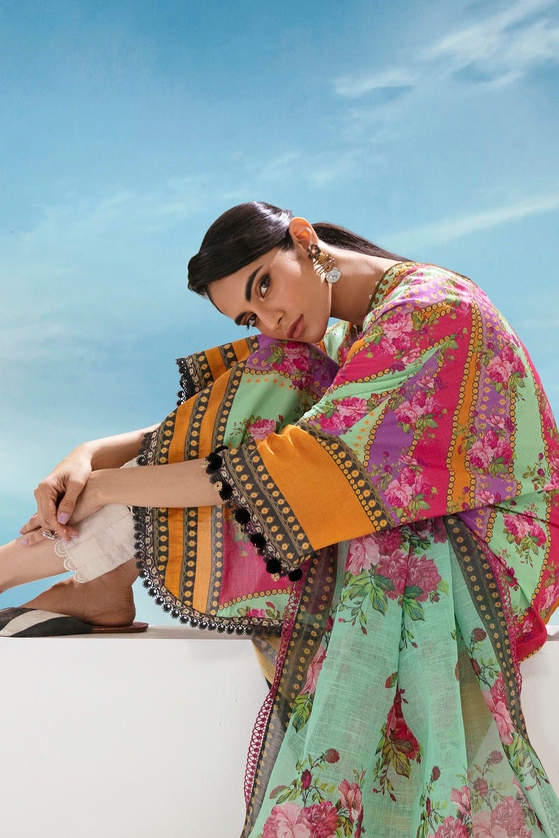 Description: A blooming beauty in every sense, this floral kali style shirt is adorned with hues of a radiant spring. The matching digital printed cross slub dupatta and dyed cambric pants sets the perfect harmony.