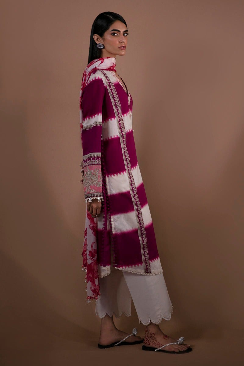 Description: The playful pop of magenta stripe upon an airy silhouette dances with the wind, breathing in the essence of summer. The ensemble is elevated by a beautifully composed floral chiffon dupatta, flowing like a gentle stream and evoking the tranquil beauty of a blossoming garde