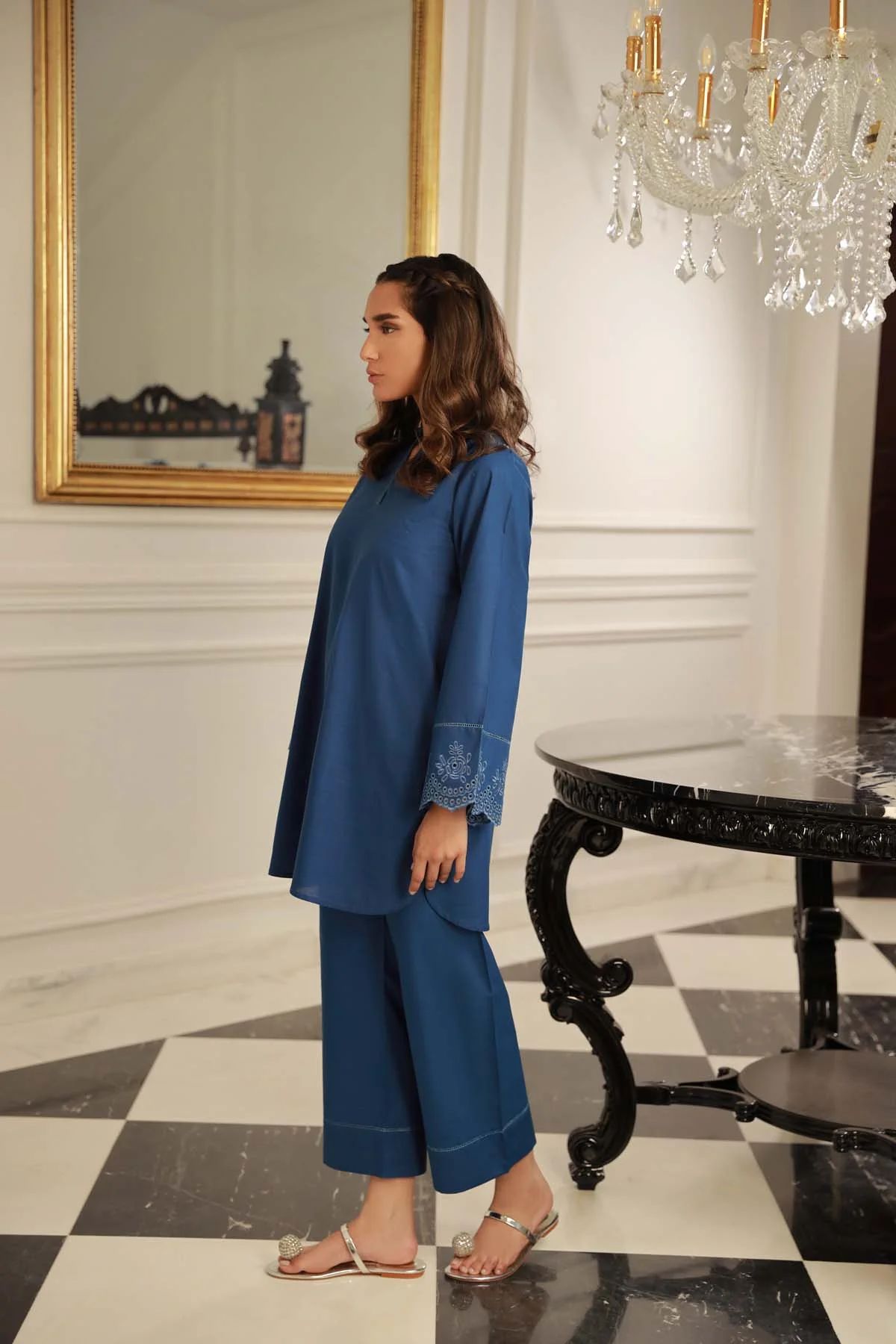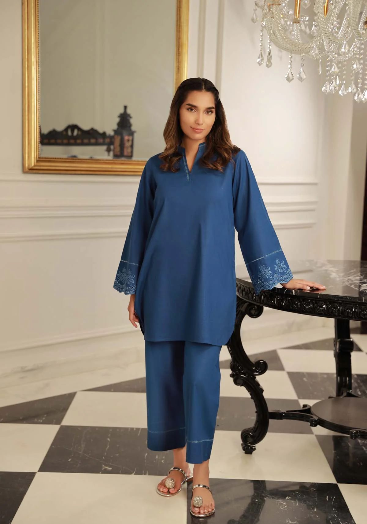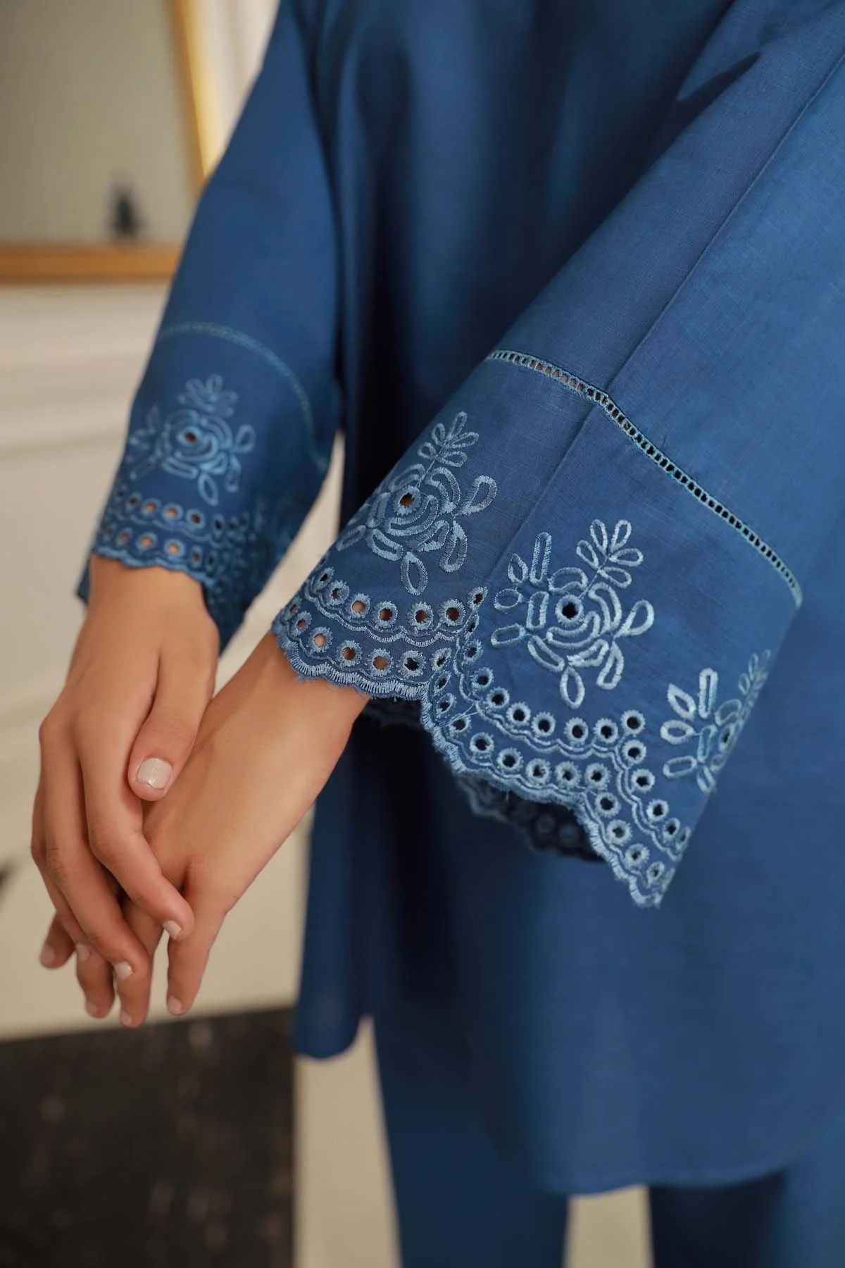 2pc Sapphire is a gorgeous blue colour co-ord outfit. The design features fashionable floral eye-let embroidery details along sleeves edges, embellished with ladder lace. Paired with straight trousers. A chic new style to look amazing in.