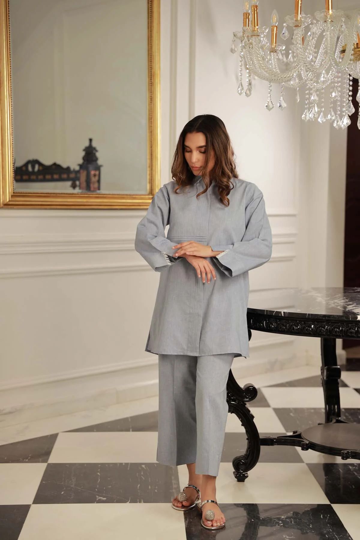 2pc Blue Chambray colour basic co-ord outfit. Featuring classic style spread collar design, stunning minimalist pintex detailing along the placket and front, stylized slit sleeves and paired with straight trousers.