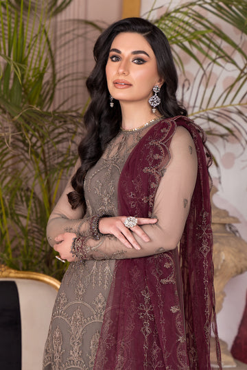 Crafted on a luscious canvas in light brown base representing elegant work of art, this ensemble is a vision to praise. It comes paired with a beautifully designed contrasting dupatta in shade of maroon giving it an enhanced aura. Shirt Front: Embroidered Net Shirt Back: Embroidered Net Sleeves: Embroidered Net Dupatta