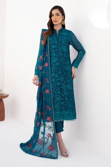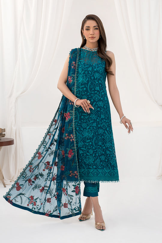 Eye captivating canvas adorned in hued embroidery on a teal canvas, this art piece comes with multi thread shawl crafted intricately to bring life to a subtle base. Shirt Front Embroidered Chiffon Shirt Back Embroidered Chiffon Sleeves Embroidered Chiffon Dupatta Embroidered Chiffon Front & Back Lace Embroidered.